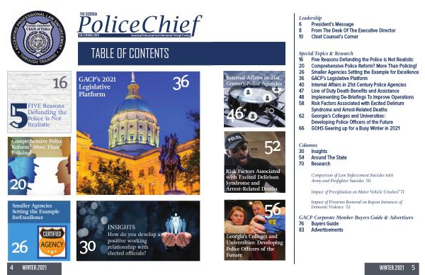 4 WINTER . 2021 TABLE OF CONTENTS How do you develop a positive working relationship with elected officials ? PoliceChief THE GEORGIA Accenting Professional Law Enforcement Through Training FALL EDITION | 2020 30 INSIGHTS 5FIVE Reasons Defunding the Police is Not Realistic 16 Comprehensive Police Reform ? More Than Policing ! 20 Smaller Agencies Setting the Example forExcellence 26 36 GACP ’ s 2021 Legislative Platform