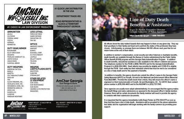 In addition to benefits , the agency should also submit the officer ’ s name to the Georgia Public Safety Memorial ( GPSTC ) in Forsyth , GA and to the National Law Enforcement Officer Memorial Fund ( NLEOMF ). Provided the death meets their criteria , they will ensure the officer ’ s name is engraved on their memorial walls in Forsyth , GA and Washington , DC . For GPSTC their contact phone number is ( 478 ) 996-4405 and for the NLEOMF it is ( 202 ) 737-7981 .
