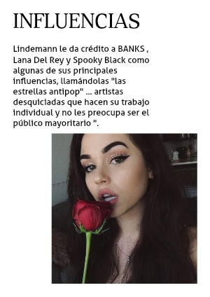 Lindemann le da crédito a BANKS , Lana Del Rey y Spooky Black como algunas de sus principales influencias, llamándolas "las estrellas antipop" ... artistas desquiciadas que hacen su trabajo individual y no les preocupa ser el público mayoritario ".