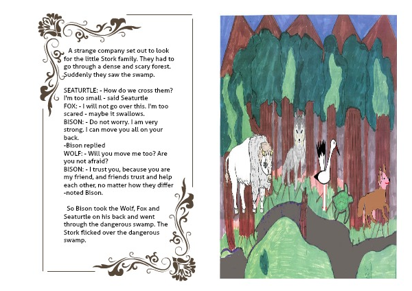 So Bison took the Wolf, Fox and Seaturtle on his back and went through the dangerous swamp. The Stork flicked over the dangerous swamp.