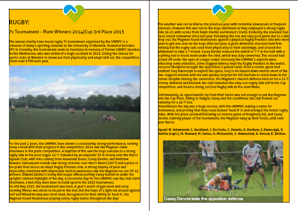 The annual charity inter-mural rugby 7s tournament organised by the UWRFC is a pinnacle of many a sporting calendar at the University of Warwick. Hosted at Earlsdon RFC in Coventry, the tournament seeks to fundraise in memory of former UWRFC member Archie Wellbelove, who was victim of a tragic accident in 2012. Giving the chance for sports clubs at Warwick to showcase their physicality and adept skill set, the competition raises over £700 each year.