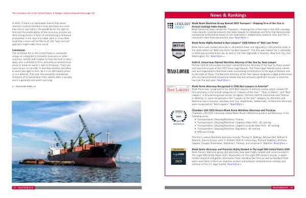 Blank Rome Attorneys Recognized in 2026 Best Lawyers in America ® Blank Rome was recognized in the 2026 Best Lawyers in America survey, which ranked 235 firm attorneys in the annual categories of“ Lawyers of the Year,”“ Ones to Watch,” and“ Best Lawyers” in 60 practice groups across 14 regions. Partners Keith B. Letourneau and Thomas H. Belknap, Jr., were recognized in the“ Lawyers of the Year” category for Admiralty and Maritime Law in Houston and New York City, respectively. Additionally, 14 Maritime attorneys were recognized as“ Best Lawyers.” Read More »