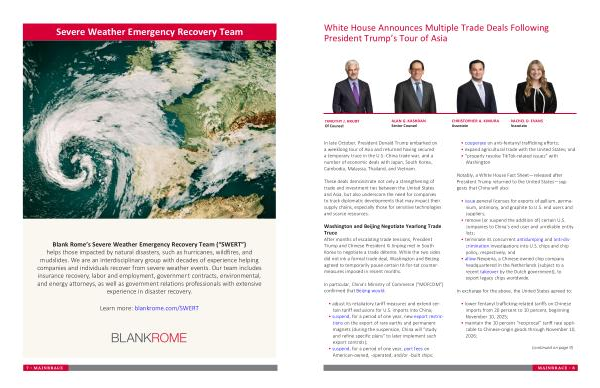 Blank Rome’ s Severe Weather Emergency Recovery Team(“ SWERT”) helps those impacted by natural disasters, such as hurricanes, wildfires, and mudslides. We are an interdisciplinary group with decades of experience helping companies and individuals recover from severe weather events. Our team includes insurance recovery, labor and employment, government contracts, environmental, and energy attorneys, as well as government relations professionals with extensive experience in disaster recovery.