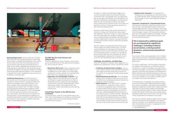 Introduction: A New Era for Maritime Decarbonization The International Maritime Organization’ s(“ IMO”) Marine Environment Protection Committee approved a sweeping package of draft regulations known as the“ IMO Net-Zero Shipping Framework”( the“ Framework”) in April 2025. This Framework will be voted on in October 2025 and, if adopted, will enter into force by March 2027. It marks an ambitious and comprehensive global effort to align the maritime sector with international climate goals. However, the Framework has also sparked significant debate among IMO member states, most notably the United States, which has voiced strong opposition to the proposed measures. This article provides an overview of the proposed regulations and broader industry implications, while also highlighting the United States’ position and the Framework’ s potential impact on the future of maritime decarbonization.