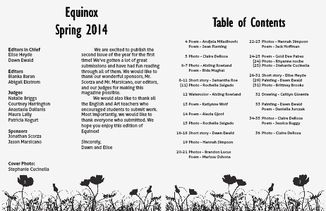 We would also like to thank all the English and Art teachers who encouraged students to submit work. Most importantly, we would like to thank everyone who submitted. We hope you enjoy this edition of Equinox!