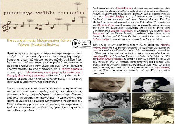 Η μελοποιημένη ποίηση αποτελεί μία ιδιαίτερη κατηγορία, έναν σταθμό στα μουσικά δρώμενα. Μελοποιημένη ποίηση θεωρείται το ποιητικό κείμενο που έχει εκδοθεί σε βιβλίο ή έχει δημοσιευτεί σε κάποιο λογοτεχνικό περιοδικό. Μερικά από τα ωραιότερα τραγούδια στην χώρα μας ανήκουν σε μεγάλους Έλληνες ποιητές, τα οποία συνδέθηκαν με εποχές-ορόσημα στην ιστορία. Η Μικρασιατική καταστροφή, η Αντίσταση και η Κατοχή, ο Εμφύλιος, η Δικτατορία. Μέσα από την μελοποιημένη ποίηση, εκφράστηκαν έντονα συναισθήματα, πεποιθήσεις, ιδεολογία, έρωτες, πάθη, προβληματισμοί.