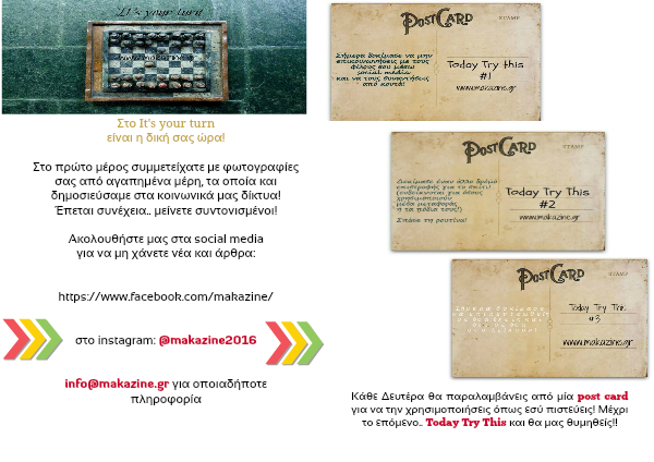 Κάθε Δευτέρα θα παραλαμβάνεις από μία post card για να την χρησιμοποιήσεις όπως εσύ πιστεύεις! Μέχρι το επόμενο.. Today Try This και θα μας θυμηθείς!!