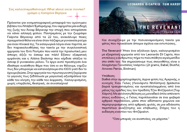 The Revenant! Ήταν ένα αξιόλογο έργο, καλογυρισμένο με εξαιρετική ερμηνεία από τον Leonardo Di Caprio, που επιτέλους ο άνθρωπος πήρε το πολυπόθητο αγαλματίδιο στο σπίτι του. Να σημειώσουμε πως σκηνοθέτης είναι ο Αλεχάντρο Γκονσάλες Ινιάριτου (21 grams, Babel, Biutiful, Amores Perros, Birdman).