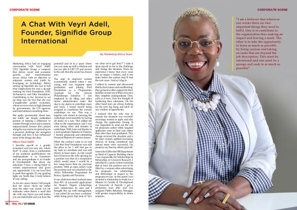 Marketing Africa had an engaging conversation with Veyrl Adell , CEO , Signifide Group , a company that drives social and economic growth and transformation across Africa with an objective to empower women and youth by leveraging on technology . Before setting up Signifide she was in full time employment for over a decade working for Ford Foundation , ILRI , Technoserve , and Nike Foundation . Contributing to her decision to set up shop was the fact that she was a-sought-after gender economist , whose services were in high demand by governments , the UN agencies and international consulting firms .