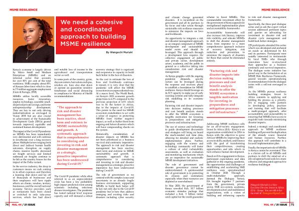 As the cost in estimate the loss of lives and livelihoods continues to mount , it is very clear that the pandemic will affect the MSME ecosystem in an unprecedented way . At a macro level , The World Bank , cut Kenya ’ s 2021 economic growth projections to 4.5 % compared to the previous projection of 6.8 % which was to be the fastest in Africa , due to the impacts of Covid-19 . This points to the need for MSME ecosystem stakeholders to act with a sense of urgency in protecting MSMEs from further negative impact , as well as buffer them from ongoing and future disasters which will have compounding shocks on the system .