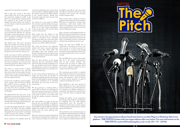 You now have the opportunity to tell your brand story however you like ! Plug in to Marketing Africa ’ s new platform - THE PITCH ! Connect with your target audiences like never before . For more information on the THE PITCH , email : info @ marketingafrica . co . ke or call + 254 - 717 - 529 052 .