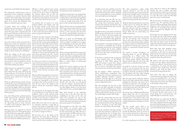 In Kenya you hear of parties only during elections and they vanish thereafter . If parties in Kenya were truly ideological in nature then the comical party hopping that has become the order of the day as everyone tries to position themselves to be in the next government would not be taking place . Strong and vibrant parties are the only antidote to toxic tribal voting blocs and the only way to move to issue based politics and away from personality cult ones . A good idea should sell across tribal boundaries and the party with the best proposition wins .