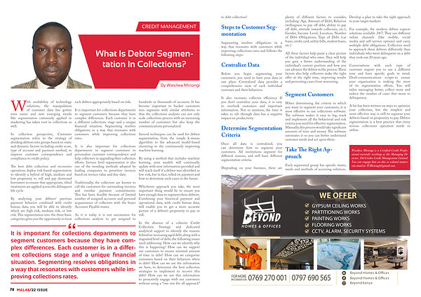 In the absence of a cohesive Credit Collection Strategy and dedicated analytical support to identify the reasons behind an increasing aged debt , along with a stagnated level of debt , the following issues need addressing : How can we identify why this is happening ? How can we support our customers to ensure minimal amount of time in debt ? How can we categorize customers based on their behaviors when in debt ? How can we use the information we have , to determine the best collection strategies to implement to recover this debt ? How can we use this information to proactively engage with our customers without using a “ one size fits all approach ”