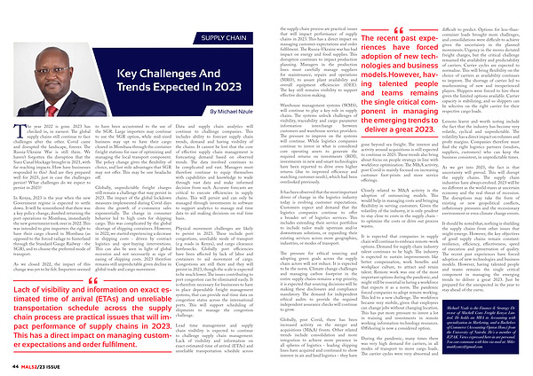 Physical movement challenges are likely to persist in 2023 . These include port congestions , unreliable mode of transport ( e . g roads in Kenya ), and cargo clearance bottlenecks . Globally port efficiencies have been affected by lack of labor and containers to aid movement of cargo . Congestions are still there and they will persist in 2023 , though the scale is expected to be much lower . The issues contributing to port congestion can be eliminated easily . It is therefore necessary for businesses to have in place dependable freight management systems , that can provide real-time data on congestion status across the international ports . This will support scheduling of shipments to manage the congestion challenge .