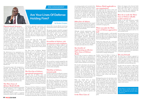 Just like with any initiative , a Three Lines of Defense concept that is poorly thought out and executed will do more harm than good . Organizations should carefully assess their current structure for both strengths and shortcomings in order to make the best use of this Model and continually improve their risk management capabilities . By doing this , the firm ’ s value will be enriched . Correct and effective application of the Three Lines of Defense model will thus enhance corporate resilience to risks and support value creation .