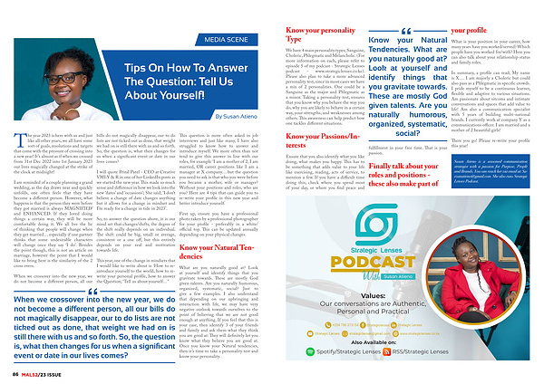 In summary , a profile can read ; My name is X …. I am majorly a Choleric but could also pass as a Phlegmatic in specific crowds . I pride myself to be a continuous learner , flexible and adaptive to various situations . Am passionate about sitcoms and intimate conversations and spaces that add value to life ! Am also a communication specialist with 5 years of building multi-national brands . I currently work at company Y as a communications officer . I am married and a mother of 2 beautiful girls !