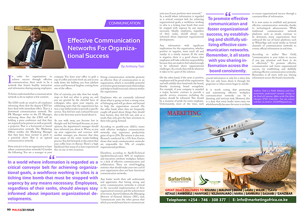 According to author Theo Gold , “ communication is your ticket to success if you pay attention and learn to do it effectively .” To promote effective communication and foster organizational success , try establishing and skillfully utilizing effective communication networks . Remember , it all starts with you sharing information across the board consistently .