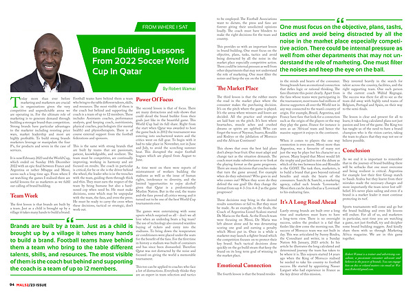 Sports tournaments will come and go but the brand building and even life lessons will endure . For all of us , and marketers in particular , next time you are watching a game , not just football , try and decipher some brand building nuggets . And kindly share them with us through Marketing Africa magazine . We are in this game together .