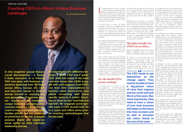 In this insightful special feature , Lionel Marumahoko - a former C-Suite executive in a Fortune 500 com-pany with business experience spanning over 30 years across Africa , Europe , the USA and Asia who ‘ retired ’ in 2018 to devote himself to coaching the next generation of business leaders - argues that the continent ’ s unique business operating environment requires a CEO to have a coach to help them navi-gate past familiar pitfalls and the challenges presented by people , business purpose , digital and organi-zational agility on their corporate leadership journey .