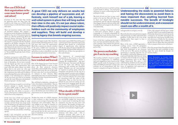 My coaching method is based on regular one-on-one engagements , in confidence , and each engagement varies based on the CEO ’ s specific needs . I ’ m keeping in mind that each CEO goes through a unique and evolving set of circumstances , and this requires a uniquely evolving set of solutions and approaches to navigate correctly .