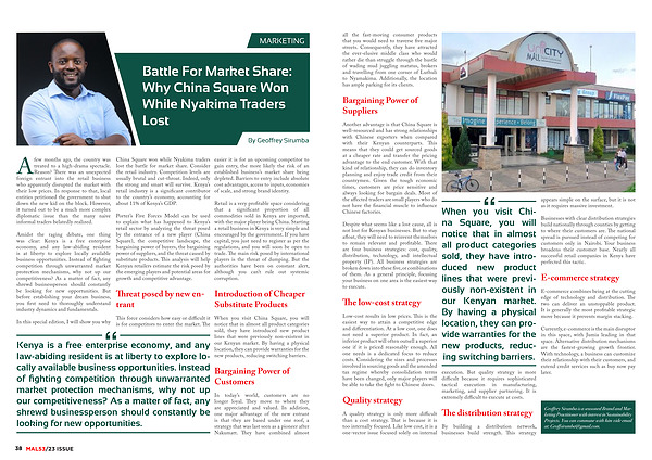 Another advantage is that China Square is well-resourced and has strong relationships with Chinese exporters when compared with their Kenyan counterparts . This means that they could get sourced goods at a cheaper rate and transfer the pricing advantage to the end customer . With that kind of relationship , they can do inventory planning and enjoy trade credit from their countrymen . Given the tough economic times , customers are price sensitive and always looking for bargain deals . Most of the affected traders are small players who do not have the financial muscle to influence Chinese factories .