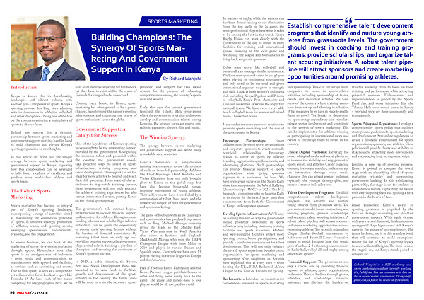 In this article , we delve into the unique synergy between sports marketing and government support in Kenya , exploring how this collaboration can be leveraged to help foster a culture of excellence and produce more world-class athletes and sports teams
