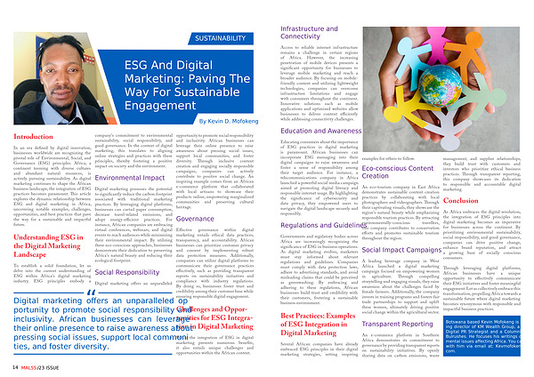 Through leveraging digital platforms , African businesses have a unique opportunity to effectively communicate their ESG initiatives and foster meaningful engagement . Let us collectively embrace this transformation , propelling Africa towards a sustainable future where digital marketing becomes synonymous with responsible and impactful business practices .
