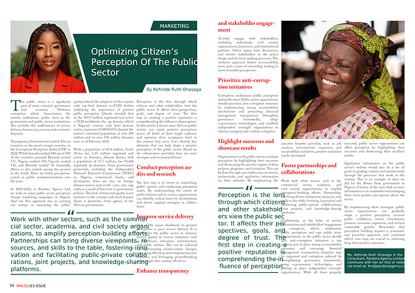 Furthermore , at the helm of service optimization and stakeholders ’ engagement is corruption , which undermines public perception and saps public trust . Organizations in the public sector should give anti-corruption initiatives a top priority , put in place strong accountability measures , and encourage financial management transparency . Integrity may be improved and corruption reduced by strengthening governance frameworks , using e-governance technologies , and putting in place independent oversight organizations . With all these properly executed , public sector organizations can affect perception by highlighting their successes and showcasing their excellent results .
