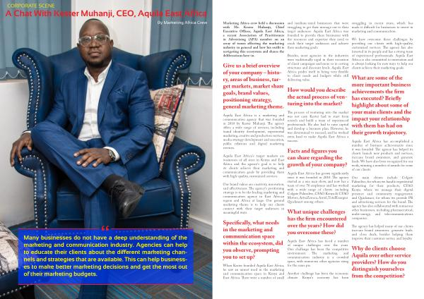 Marketing Africa crew held a discussion with Mr . Kester Muhanji , Chief Executive Officer , Aquila East Africa , a recent Association of Practitioners in Advertising ( APA ) member on an array of issues affecting the marketing industry in general and how his outfit is navigating this ecosystem and shares the deliberations here-in .