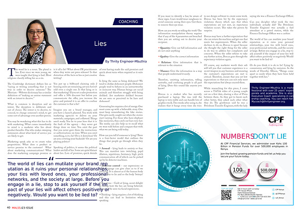 The world of lies can mutilate your brand reputation as it ruins your personal relationships , your ties with loved ones , your professional networks , and the society at large . Before you engage in a lie , stop to ask yourself if the impact of your lies will affect others positively or negatively . Would you want to be lied to ? of ever having made the said promises and quick about turns when required as it suits them .