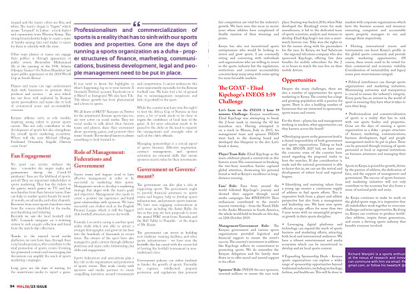Sponsors ’ Role : INEOS the race sponsors , invested millions to ensure the race took place . Starting way back in 2016 , when Nike developed the Breaking2 event for male marathoners , it led to the dedicated team of sports scientists , analysts and trainers to develop Eliud Kipchoge ’ s run into a mustwatch historic run . Nike won the rights to kit the runner along with his pacemakers for the race . In Kenya , we had Safaricom - the regional telcomms company who also sponsored Kipchoge , offering free data bundles for mobile subscribers for the 2 or so hours to watch the race live on their mobile devices .