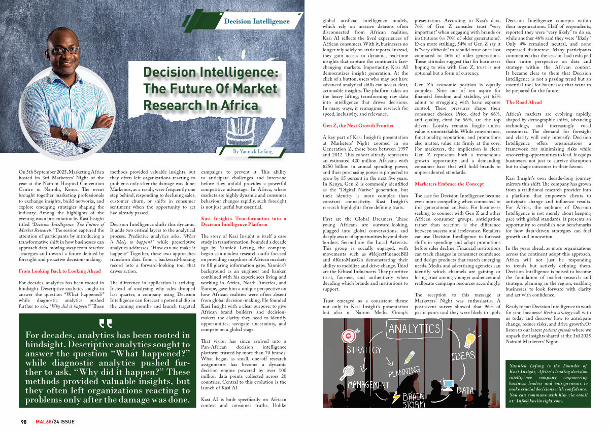 On 5th September 2025, Marketing Africa hosted its 3rd Marketers’ Night of the year at the Nairobi Hospital Convention Centre in Nairobi, Kenya. The event brought together marketing professionals to exchange insights, build networks, and explore emerging strategies shaping the industry. Among the highlights of the evening was a presentation by Kasi Insight titled“ Decision Intelligence: The Future of Market Research.” The session captured the attention of participants by introducing a transformative shift in how businesses can approach data, moving away from reactive strategies and toward a future defined by foresight and proactive decision-making.