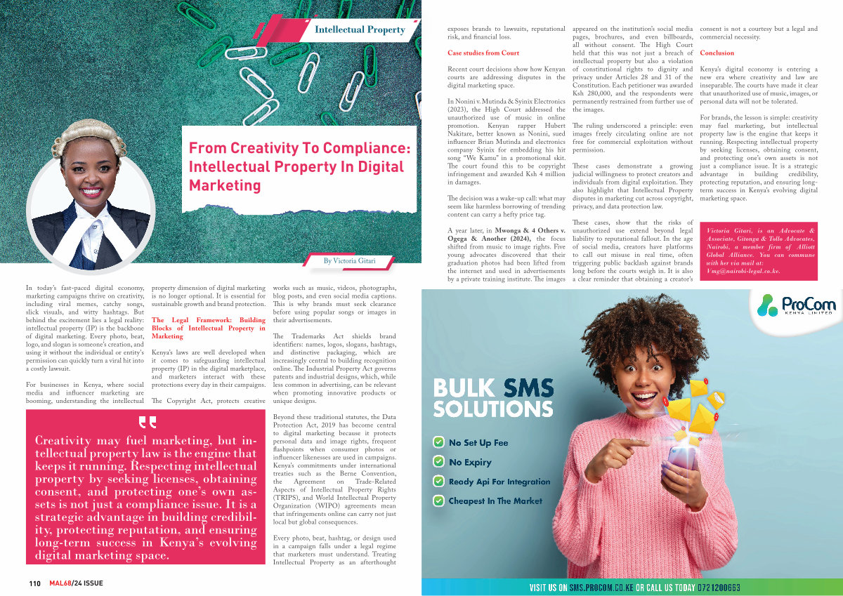 For brands, the lesson is simple: creativity may fuel marketing, but intellectual property law is the engine that keeps it running. Respecting intellectual property by seeking licenses, obtaining consent, and protecting one’ s own assets is not just a compliance issue. It is a strategic advantage in building credibility, protecting reputation, and ensuring longterm success in Kenya’ s evolving digital marketing space.