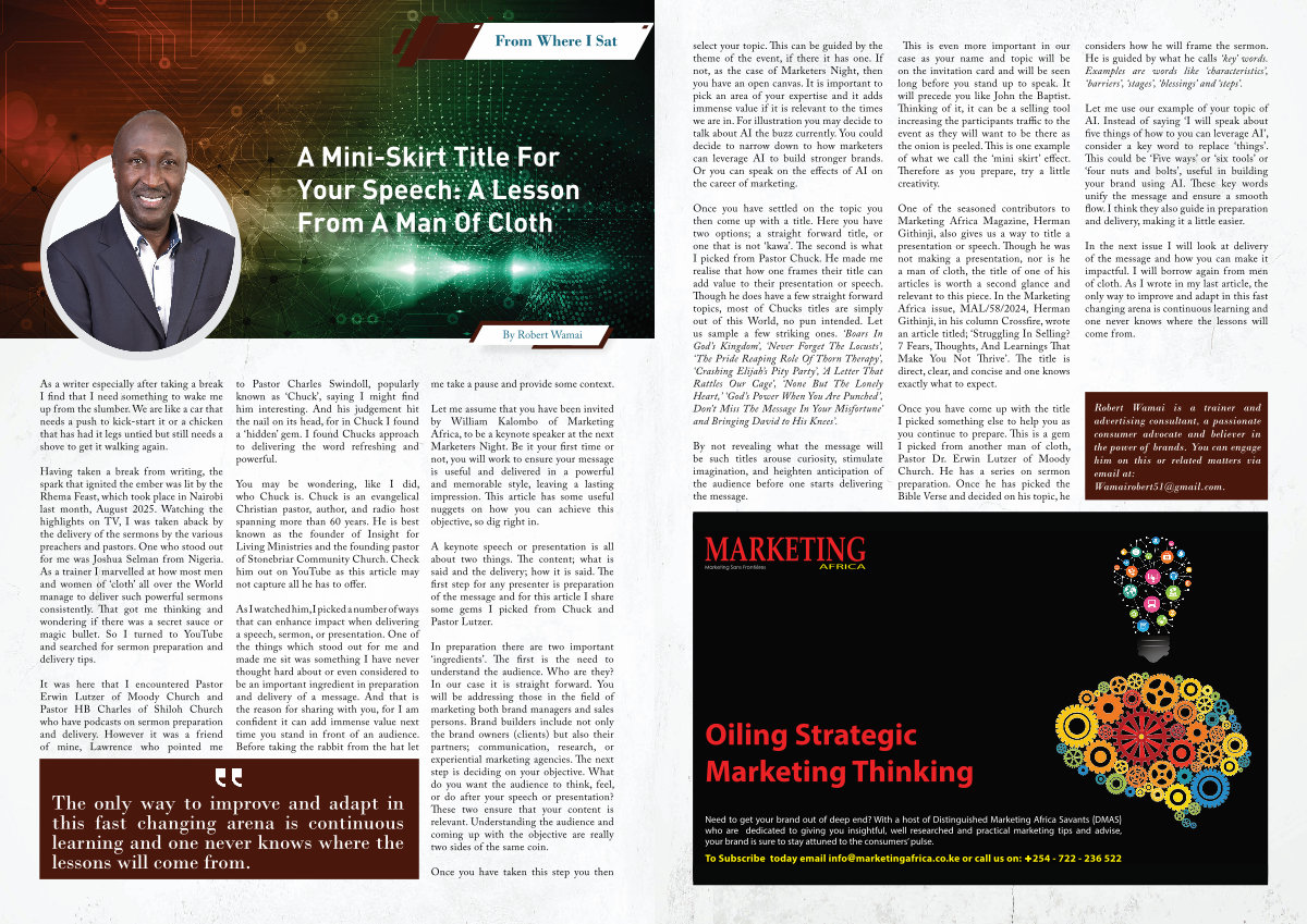 One of the seasoned contributors to Marketing Africa Magazine, Herman Githinji, also gives us a way to title a presentation or speech. Though he was not making a presentation, nor is he a man of cloth, the title of one of his articles is worth a second glance and relevant to this piece. In the Marketing Africa issue, MAL / 58 / 2024, Herman Githinji, in his column Crossfire, wrote an article titled;‘ Struggling In Selling? 7 Fears, Thoughts, And Learnings That Make You Not Thrive’. The title is direct, clear, and concise and one knows exactly what to expect.