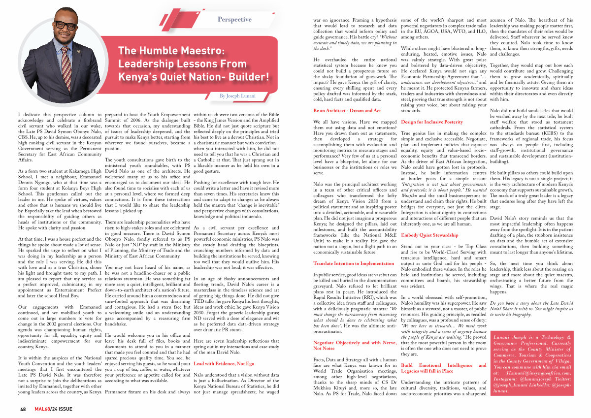 In an age of flashy announcements and fleeting trends, David Nalo’ s career is a masterclass in the timeless science and art of getting big things done. He did not give TED talks; he gave Kenya his best thoughts, ideas and work ethic; he gave Kenya Vision 2030. Forget the generic leadership gurus; ND served with a dose of elegance and wit as he preferred data data-driven strategy over dramatic PR stunts.