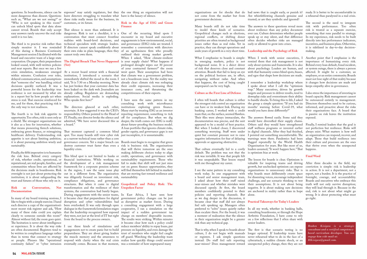 questions. In boardrooms, silence can be more dangerous than dissent. Questions such as,“ What are we not seeing?” or“ Who is not speaking in this room?” can unlock blind spots that data alone cannot reveal. Boards that only accept easy answers rarely uncover the real risks until it is too late.