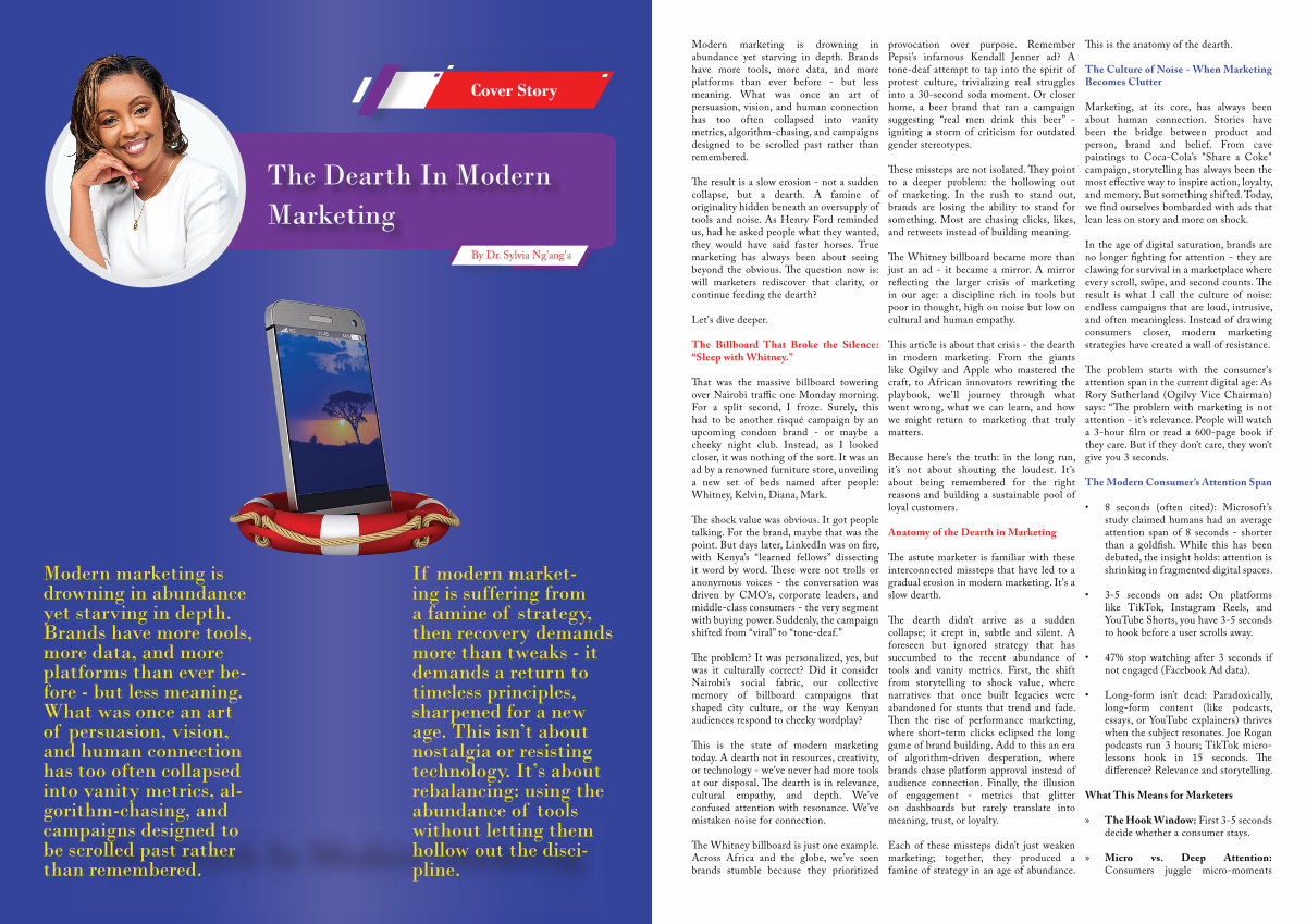 Modern marketing is drowning in abundance yet starving in depth. Brands have more tools, more data, and more platforms than ever before- but less meaning. What was once an art of persuasion, vision, and human connection has too often collapsed into vanity metrics, algorithm-chasing, and campaigns designed to be scrolled past rather than remembered.