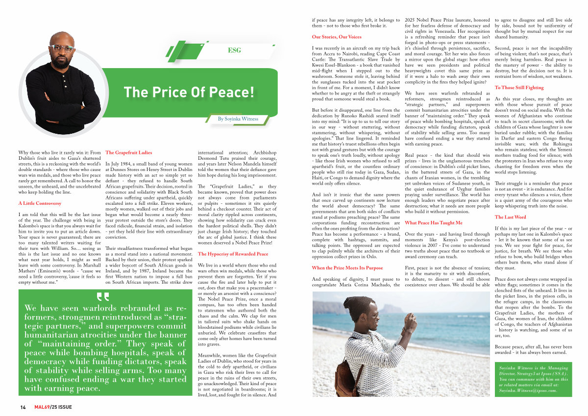 Real peace- the kind that should win prizes- lives in the unglamorous trenches of conscience: in Dublin’ s cold picket lines, in the battered streets of Gaza, in the chants of Iranian women, in the trembling yet unbroken voices of Sudanese youth, in the quiet endurance of Uyghur families praying under surveillance. The world has enough leaders who negotiate peace after destruction; what it needs are more people who build it without permission.