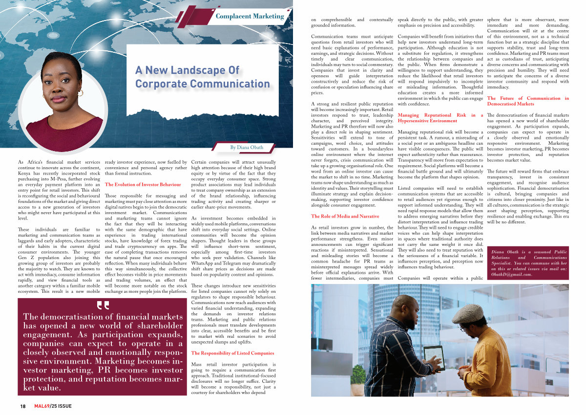 The democratisation of financial markets has opened a new world of shareholder engagement. As participation expands, companies can expect to operate in a closely observed and emotionally responsive environment. Marketing becomes investor marketing, PR becomes investor protection, and reputation becomes market value.