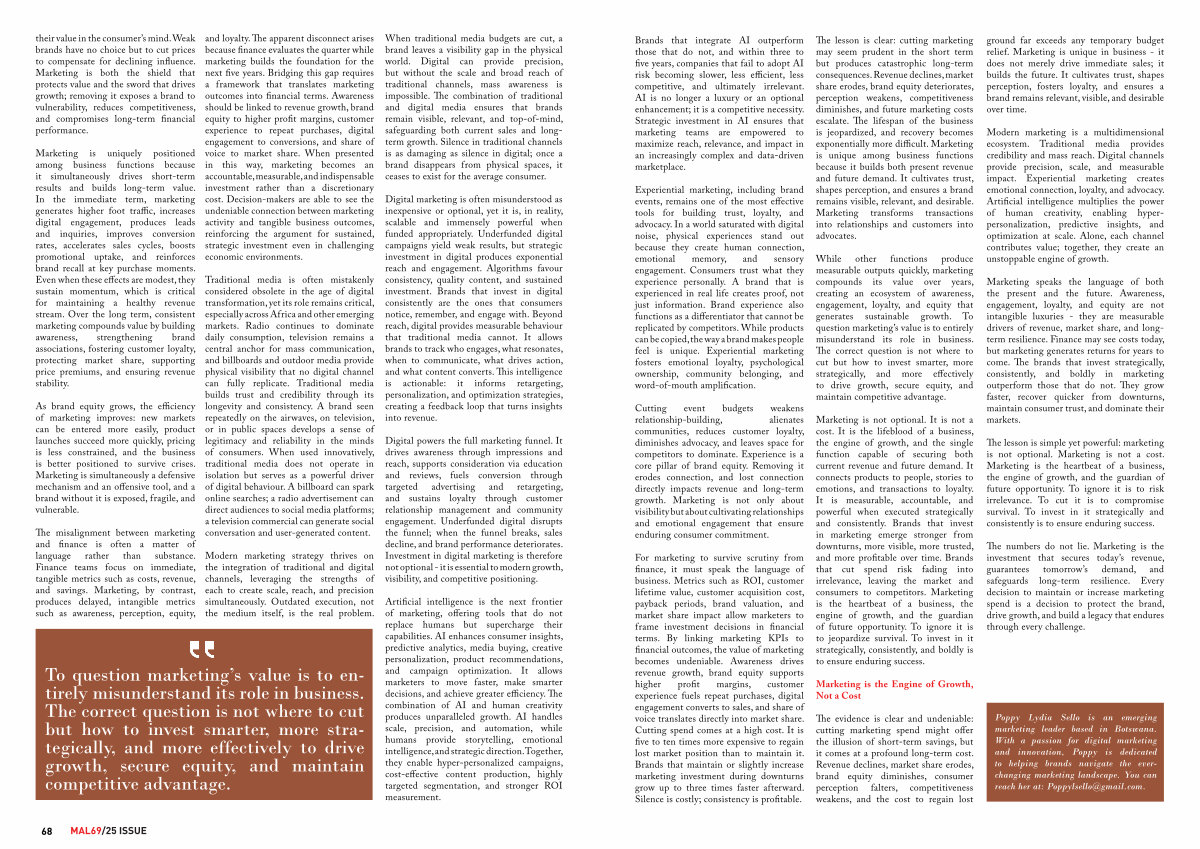 their value in the consumer’ s mind. Weak brands have no choice but to cut prices to compensate for declining influence. Marketing is both the shield that protects value and the sword that drives growth; removing it exposes a brand to vulnerability, reduces competitiveness, and compromises long-term financial performance.