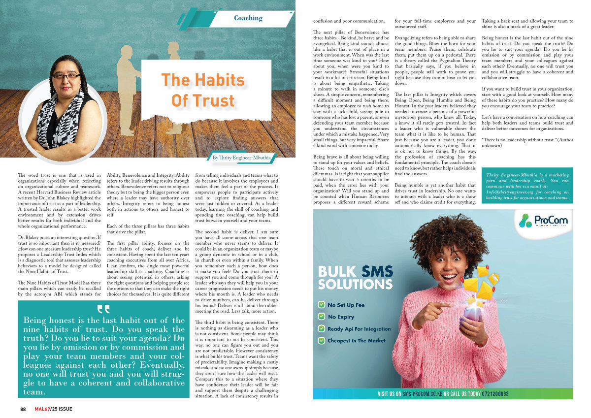 Thrity Engineer-Mbuthia is a marketing guru and leadership coach. You can commune with her via email at: Info @ thrityengineer. org for coaching on building trust for organizations and teams.