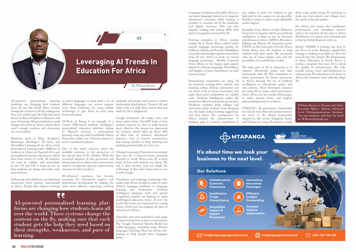 AI-powered personalized learning platforms are changing how students learn all over the world. These systems change the content on the fly, making sure that each student gets the help they need based on their strengths, weaknesses, and pace of learning. AI personalization could change education in Africa, where there aren ' t enough teachers and classrooms are overcrowded.