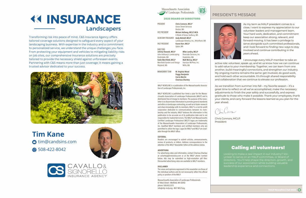 MALP NEWSLINE is published four times a year for the Massachusetts Association of Landscape Professionals( MALP) and is distributed free of charge to members. The purpose of the newsletter is to disseminate information to promote general standards and ethics in landscape contracting, as well as to foster research and share knowledge with its members. MALP is a not-for-profit corporation dedicated to communications between its membership and the industry. MALP believes the information in this publication to be accurate as of its publication date and is not responsible for inadvertent errors. The MALP and Massachusetts Certified Landscape Professional( MCLP) logos are trademarks of the Massachusetts Association of Landscape Professionals, Inc. Qualified MALP members and certified members only are permitted to utilize the logo. Logos for MALP and MCLP are available through the MALP office.