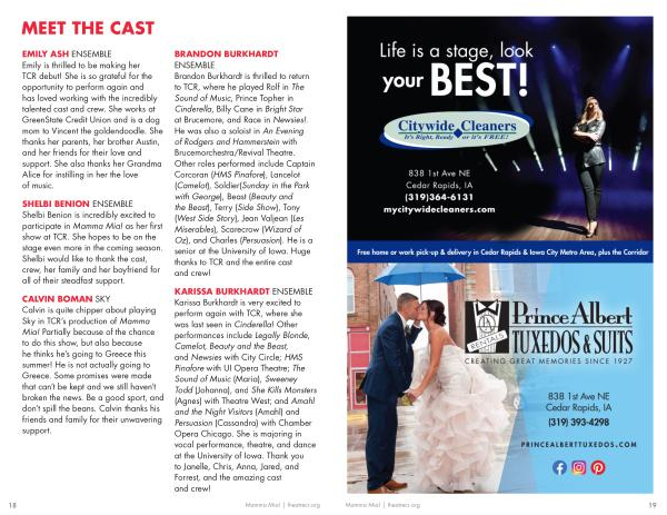 KARISSA BURKHARDT ENSEMBLE Karissa Burkhardt is very excited to perform again with TCR , where she was last seen in Cinderella ! Other performances include Legally Blonde , Camelot , Beauty and the Beast , and Newsies with City Circle ; HMS Pinafore with UI Opera Theatre ; The Sound of Music ( Maria ), Sweeney Todd ( Johanna ), and She Kills Monsters ( Agnes ) with Theatre West ; and Amahl and the Night Visitors ( Amahl ) and Persuasion ( Cassandra ) with Chamber Opera Chicago . She is majoring in vocal performance , theatre , and dance at the University of Iowa . Thank you to Janelle , Chris , Anna , Jared , and Forrest , and the amazing cast and crew !