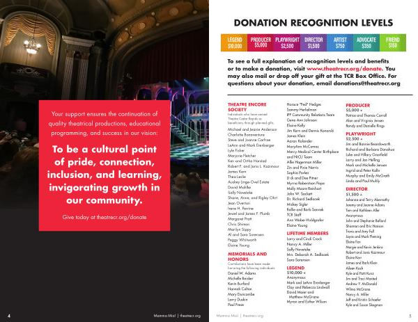 To see a full explanation of recognition levels and benefits or to make a donation , visit www . theatrecr . org / donate . You may also mail or drop off your gift at the TCR Box Office . For questions about your donation , email donations @ theatrecr . org