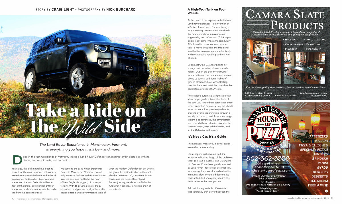 D eep in the lush woodlands of Vermont, there’ s a Land Rover Defender conquering terrain obstacles with no drama, no tire spin outs, and no panic.