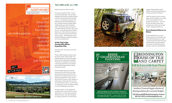There’ s a 400-horsepower engine under the hood, and yet, silence inside. The Defender glides over Vermont’ s rugged terrain like it’ s a freshly paved highway. There’ s even a refrigerator in the center console— because after all, who doesn’ t want chilled beverages while crawling through the woods?