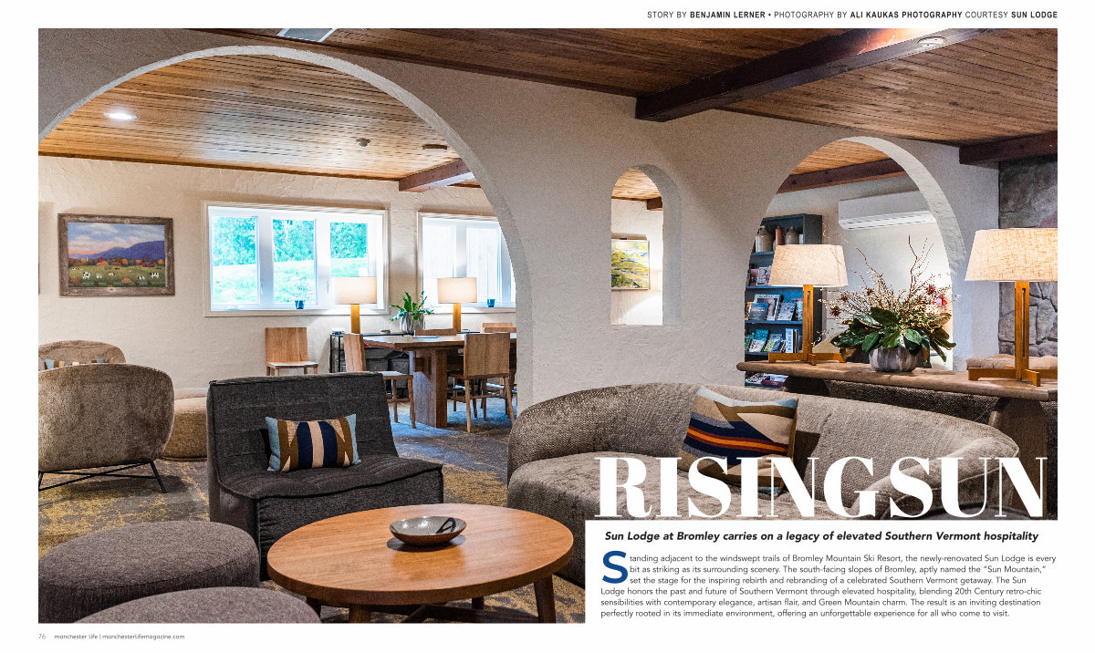 S tanding adjacent to the windswept trails of Bromley Mountain Ski Resort, the newly-renovated Sun Lodge is every bit as striking as its surrounding scenery. The south-facing slopes of Bromley, aptly named the“ Sun Mountain,” set the stage for the inspiring rebirth and rebranding of a celebrated Southern Vermont getaway. The Sun Lodge honors the past and future of Southern Vermont through elevated hospitality, blending 20th Century retro-chic sensibilities with contemporary elegance, artisan flair, and Green Mountain charm. The result is an inviting destination perfectly rooted in its immediate environment, offering an unforgettable experience for all who come to visit.