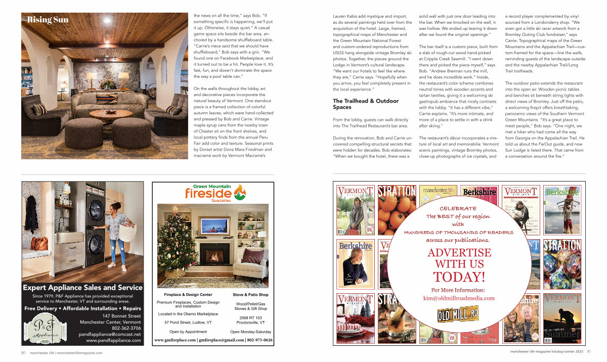 Lauren Kabis add mystique and import, as do several paintings held over from the acquisition of the hotel. Large, framed, topographical maps of Manchester and the Green Mountain National Forest and custom-ordered reproductions from USGS hang alongside vintage Bromley ski photos. Together, the pieces ground the Lodge in Vermont’ s cultural landscape.“ We want our hotels to feel like where they are,” Carrie says.“ Hopefully when you arrive, you feel completely present in the local experience.”