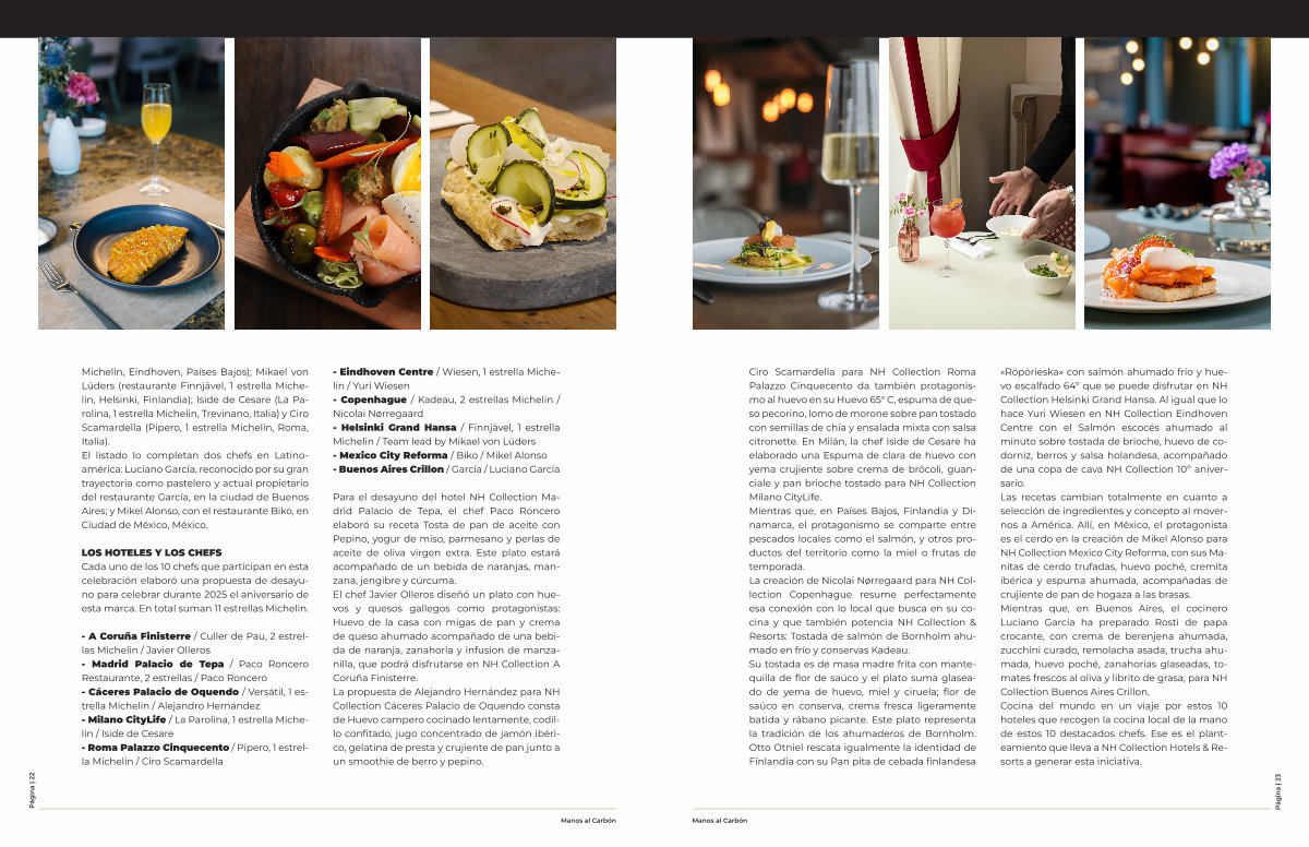 Para el desayuno del hotel NH Collection Madrid Palacio de Tepa, el chef Paco Roncero elaboró su receta Tosta de pan de aceite con Pepino, yogur de miso, parmesano y perlas de aceite de oliva virgen extra. Este plato estará acompañado de un bebida de naranjas, manzana, jengibre y cúrcuma. El chef Javier Olleros diseñó un plato con huevos y quesos gallegos como protagonistas: Huevo de la casa con migas de pan y crema de queso ahumado acompañado de una bebida de naranja, zanahoria y infusion de manzanilla, que podrá disfrutarse en NH Collection A Coruña Finisterre. La propuesta de Alejandro Hernández para NH Collection Cáceres Palacio de Oquendo consta de Huevo campero cocinado lentamente, codillo confitado, jugo concentrado de jamón ibérico, gelatina de presta y crujiente de pan junto a un smoothie de berro y pepino.
